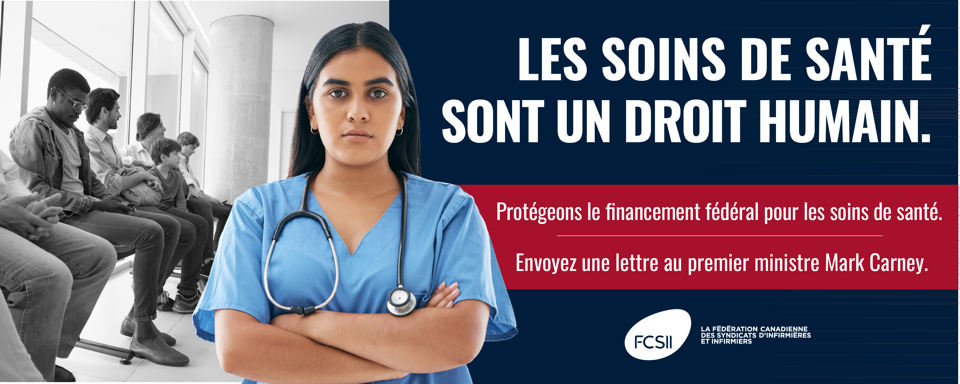 Partout au pays, le personnel infirmier et les professionnels de la santé travaillent en surcapacité et en sous-effectif, donnant tout ce qu’ils ont pour prendre soin des patients. Des solutions de dotation sécuritaire en personnel fondées sur des données probantes, telles que les ratios prescrits infirmières-patients, permettraient au personnel infirmier d’offrir aux patients la meilleure qualité de soins possible. Mais ces solutions ne fonctionneront que s’il y a un financement adéquat pour s’assurer que les infirmières et infirmiers de première ligne ont le soutien dont ils ont besoin. Ce n’est pas le moment de réduire le financement pour les soins de santé. La Fédération canadienne des syndicats d’infirmières et infirmiers demande au gouvernement fédéral d’accroître le financement des soins de santé et de veiller à ce qu’il continue d’être versé aux provinces et aux territoires sans interruption. Montrez votre soutien. Envoyez une lettre au premier ministre Mark Carney.