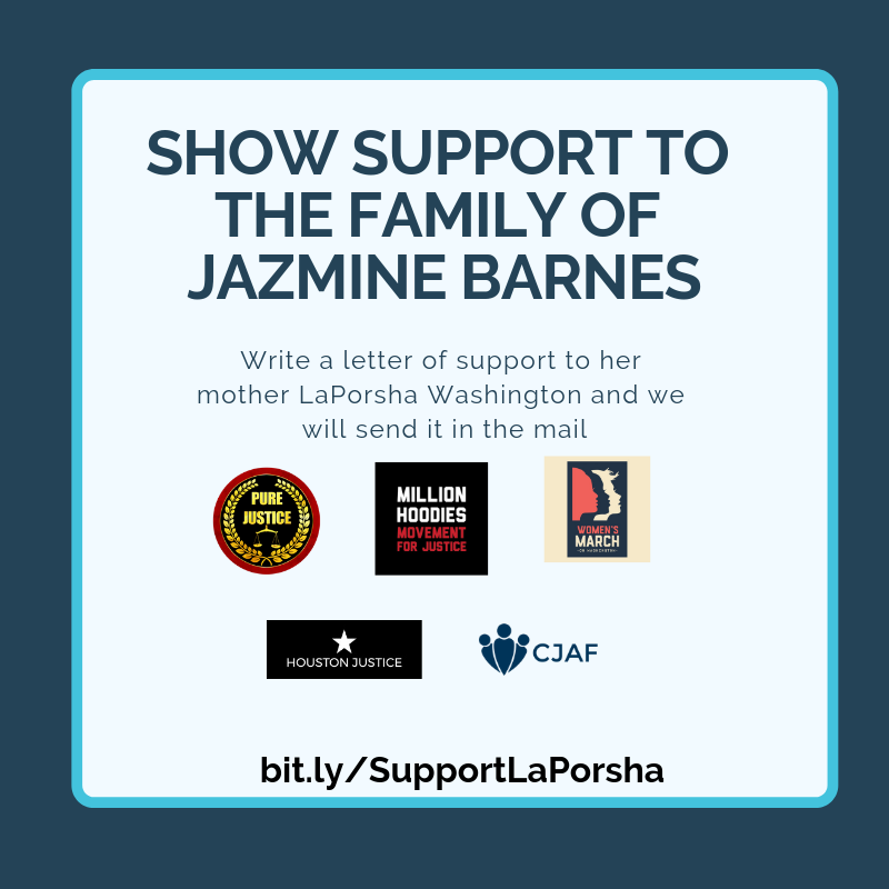 The community is grieving. People across the country are coming together to demand justice for Jazmine so we're sending your letters of support to LaPorsha Washington so that she knows that we are with her in this struggle as we demand justice for Jazmine and safer communities for all.