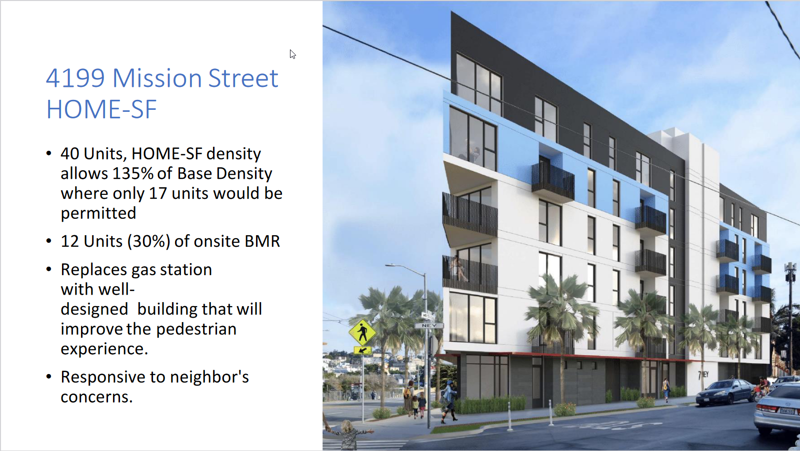 We are excited to support 40 homes replacing a gas station in a transit-rich area of the Outer Mission. Please write the Planning Commission that you support it!