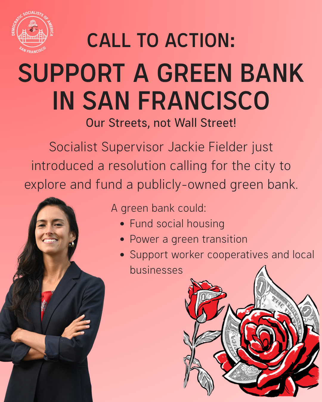The private market is not building nearly enough housing that San Franciscans can actually afford. A publicly-owned, green bank would allow for democratic control over city finances, keeping our money in our streets, not Wall Street. Low-interest loans could be provided to build to meet the needs of city, rather than to build to maximize profit.