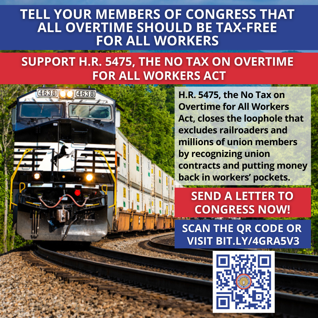 The IBEW is calling on all members, especially railroaders, to mobilize now and urge their members of Congress to support H.R. 5475, the No Tax on Overtime for All Workers Act. This bill would finally extend overtime tax relief to railroaders and millions of union members who are currently excluded.