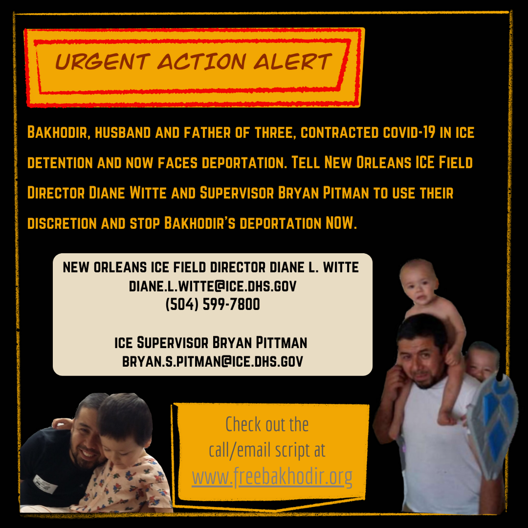 Tell New Orleans ICE Field Director Diane Witte and Supervisor Bryan Pittman to use their discretion and stop Bakhodir’s deportation NOW. It is cruel, inhumane, and dangerous to deport migrants that have COVID-19.
