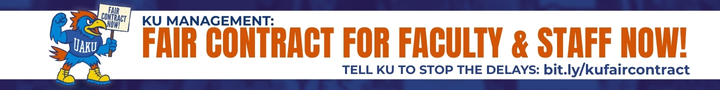 So far this year, KU has siphoned $27 million out of classroom budgets even while raising tuition by 6.5%--a whopping 11.8% since 2020 for out-of state students, and 11.5% for in-state students. Now, KU is refusing to pay faculty and academic staff a fair wage, forcing faculty to struggle for resources needed to deliver a strong public higher education. Students and Kansas families, taxpayers, and community members deserve better. Where is your money going? Not to education.