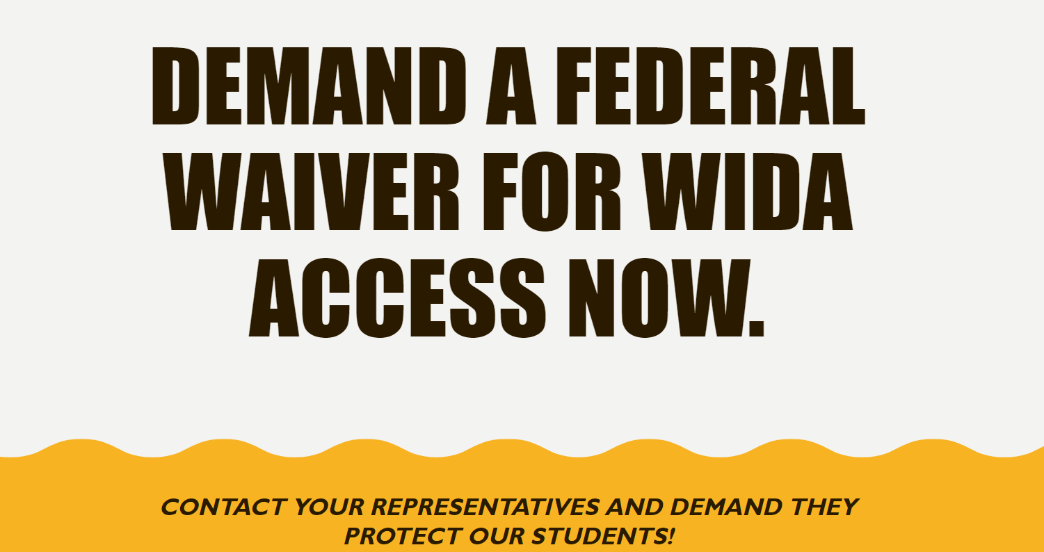 In-person, standardized testing is already starting in school districts around the country for English Learners. Only the US Department of Education can issue a waiver for the WIDA ACCESS test for the 2020-2021 school year. As it stands, the WIDA ACCESS test must be given to English Learners in-person with no remote option available. It is imperative that the US Department of Education protect English Learners and their families now by issuing a federal waiver for WIDA ACCESS testing this school year.