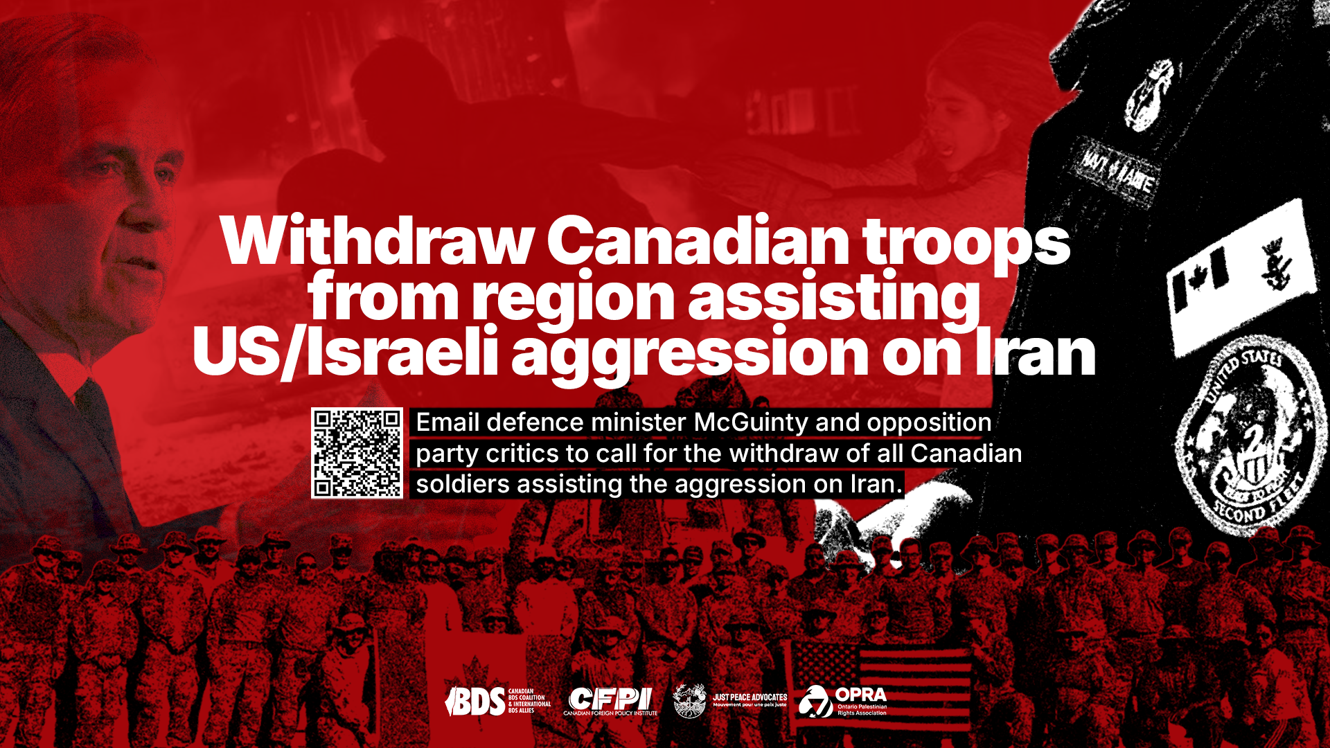 According to CBC, Canadian soldiers stationed on US bases in West Asia have assisted the US/Israeli war on Iran. Please email defence minister McGuinty and opposition party critics to call for the withdraw of all Canadian soldiers assisting the aggression on Iran.