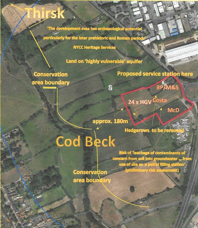 The proposed BP service station in ‘countryside' at the edge of our lovely market town in North Yorkshire will swallow up a big chunk of important green space. It will suck trade out of the town centre, threaten a ‘highly vulnerable’ aquifer, concrete over a potentially valuable heritage site, tear out nearly 400 metres of mature hedgerow – all within 180 metres of a conservation area and an ecologically rich green corridor. That’s before we even talk about climate change!