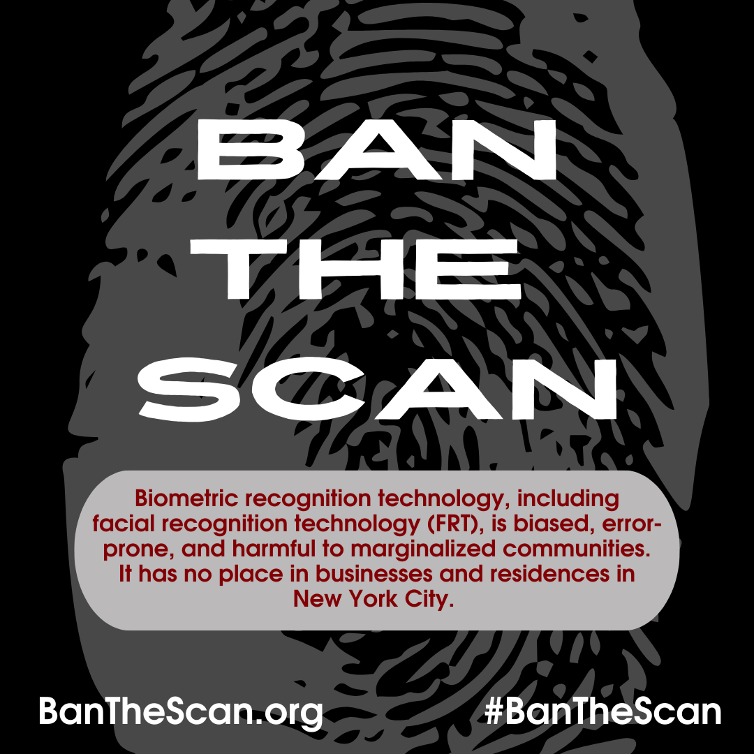 Facial recognition technology is biased and broken, and its use poses significant threats to our privacy and civil liberties. Countless studies by university researchers, nonprofit organizations, and even the U.S. federal government prove that the technology has no place in New York and continue to harm immigrants, BIPOC, Muslim, and LGBTQ+ communities. The creep of biometric surveillance technology into all aspects of life threatens New Yorkers’ civil liberties and right to privacy. Across the country, cities and states are protecting residents from facial recognition, and it’s past time for New York to do the same. Click here to read more about why we want New York to Ban the Scan!