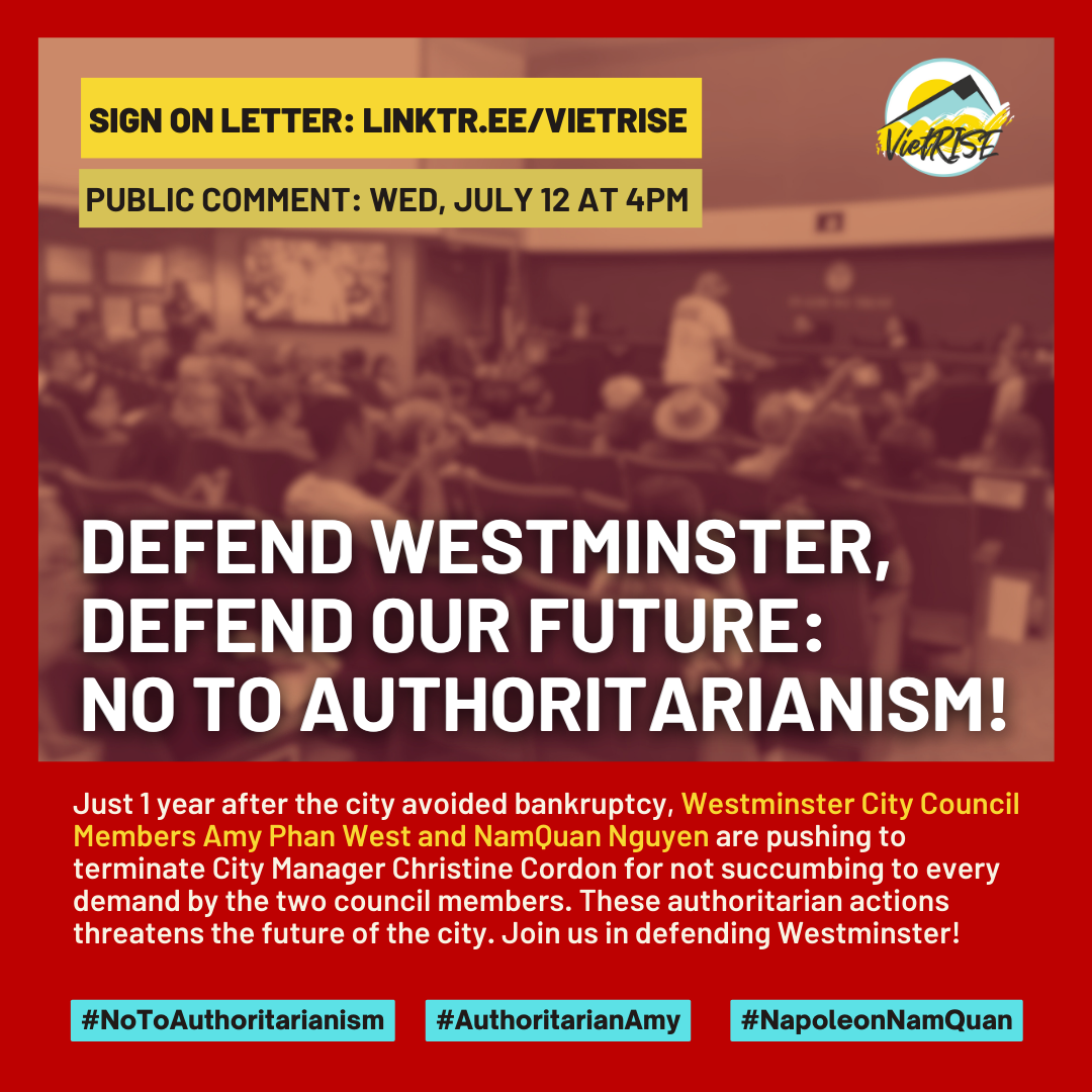 Join Vietnamese residents and Westminster Councilmember Carlos Manzo in denouncing these authoritarian actions, urging them not to fire the City Manager, and in demanding transparency, accountability, and genuine dialogue with the community.