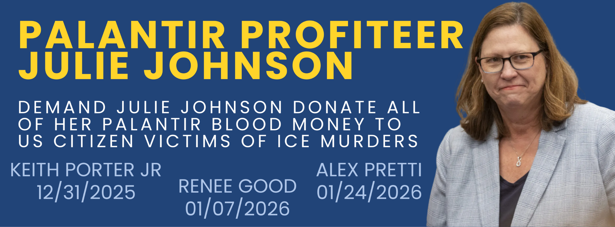 We the people of Texas 32nd, Texas 33rd, City of Dallas, Tarrant County, Texas and the US, demand that you, Rep. Julie Johnson, donate all profits from your investments in Palantir and any ICE contracted entity while serving as a Vice Ranking Member on the Committee on Homeland Security, to ICE murder victims such as Renee Good, Keith Porter Jr., and Alex Pretti.