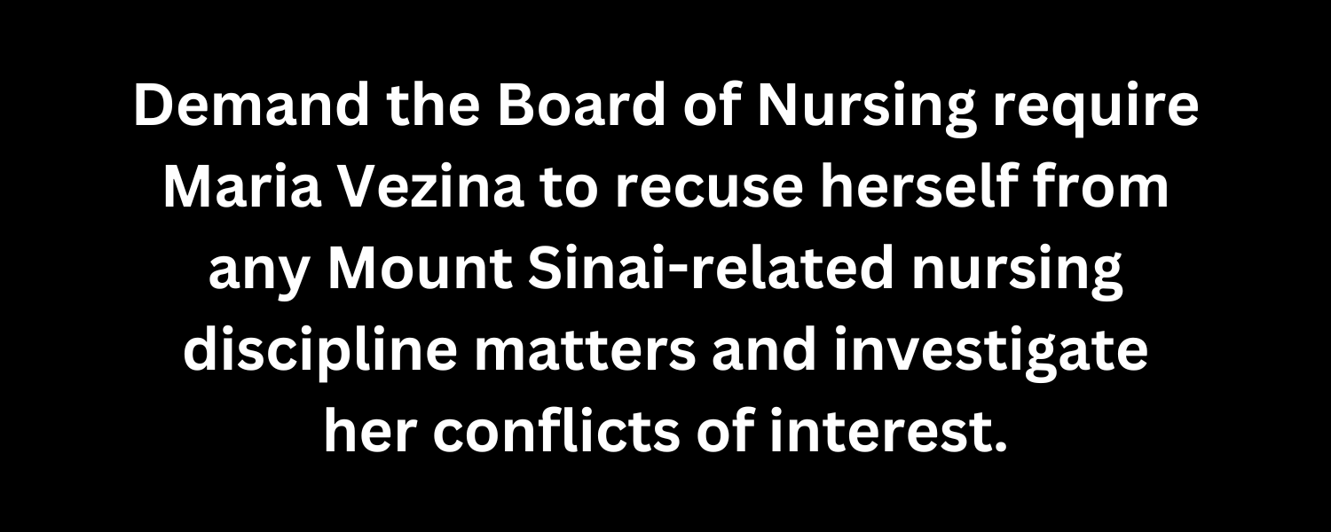 Mount Sinai Vice President of Nursing Labor Relations Partnerships, Dr. Maria Vezina, whose job includes nursing labor relations, sits on the New York State Board of Nursing that participates in nurse discipline. Mount Sinai has unfairly terminated three union nurses and is potentially reporting them to the Board of Nursing. Mount Sinai Hospital is currently in a labor dispute, with an ongoing nurses strike for unfair labor practices -- Dr. Vezina is currently on the Management negotiation team for this labor dispute. Dr. Vezina's roles in labor relations and the Board of Nursing creates an unacceptable conflict of interest and undermines trust in fair nursing oversight.