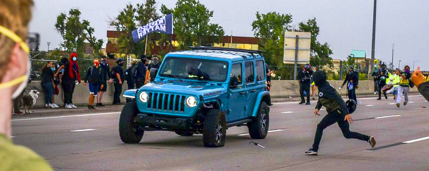 Kyle Faulkison attacked the march by driving his jeep through the crowd at speeds of over 50 mph. Before Faulkison reached the march, two people attempted to prevent his attack with their vehicles. Faulkison first swerved around a motorcycle that a protester had used to block an on-ramp. Then, as Faulkison accelerated toward the back of the march, another person steered their pickup truck into Faulkison’s jeep. The collision did not deter Faulkison, but alerted protesters of his approach.