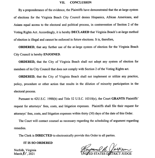 the plaintiff have demonstrated that the at-large system of elections for the Virginia Beach City Council denies Hispanics, African Americans, and Asians equal access to the electoral and political process, in contravention of Section 2 of the Voting Rights Act. Accordingly, It is hereby declared that the Virginia Beach at-large method of elections is ILLEGAL AND CAN NOT BE ENFORCED IN FUTURE ELECTIONS. The Virginia Beach City Council and its current system have been ENJOYED! We DEMAND the City of Virginia Beach take the shackles off our vote. 1.) We DEMAND a 10 single member district system to FINALLY put an END to Jim Crow. 2.) We DEMAND the city of Virginia Beach END practices and procedures that dilute and violate the rights of citizens while fleecing the city tax payers dollars to maintain its apartheid system. 3.) We DEMAND our city have a budget for each single member district from the overall city operating budget. 4.) We DEMAND the city stop using our tax payer dollars, IN OUR NAME, to discriminate against us.