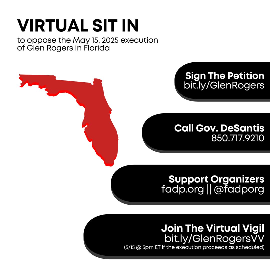 We are writing to urge you to halt the scheduled execution of Glen Rogers in Florida - set for May 15, 2025 in revenge for the 1997 murder of Tina Marie Cribbs.