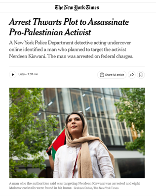 On March 27, 2026, a Hoboken resident was arrested for planning, from his Hoboken residence, to assassinate a prominent pro-Palestine activist in New York City. The federal criminal complaint details a weeks-long undercover operation specifying the target. It includes the defendant's chilling invocation of violence in the name of "self-defense," a common justification for both state and private violence against Palestinians.