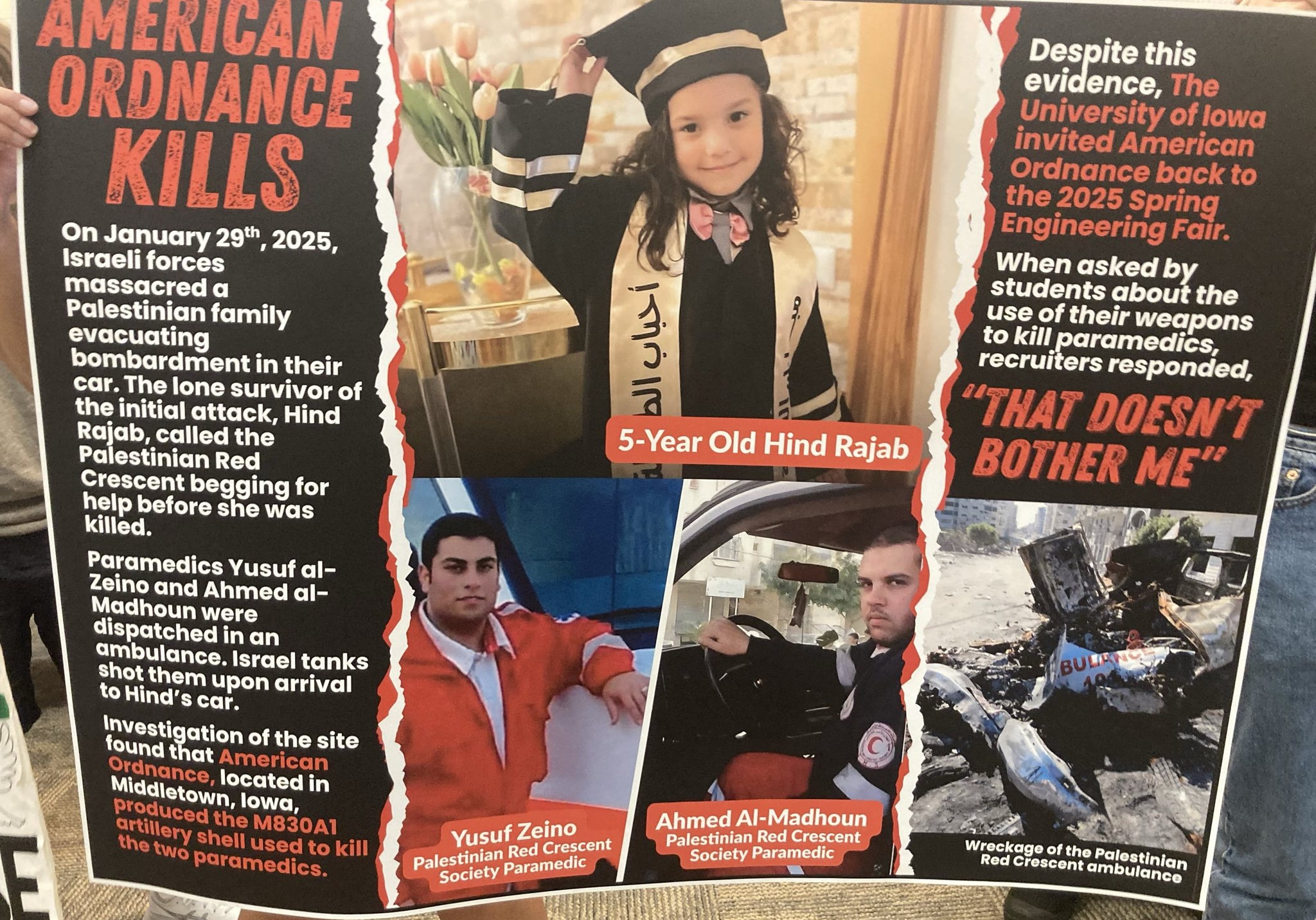 We, members of Iowa City Action for Palestine, Iowa Citians of conscience, and concerned University of Iowa students, faculty, and alumni, demand the College of Engineering address evidence that Israeli forces used an M830A1 shell produced at the Iowa Army Ammunition Plant, currently operated by American Ordnance, in the January 2024 killing of two Gazan paramedics, an international war crime. Investigation into this war crime entered into Congressional Record on June 28, 2024. Despite this documentation, American Ordnance remained in attendance at the Spring 2025 Engineering Career Fair.