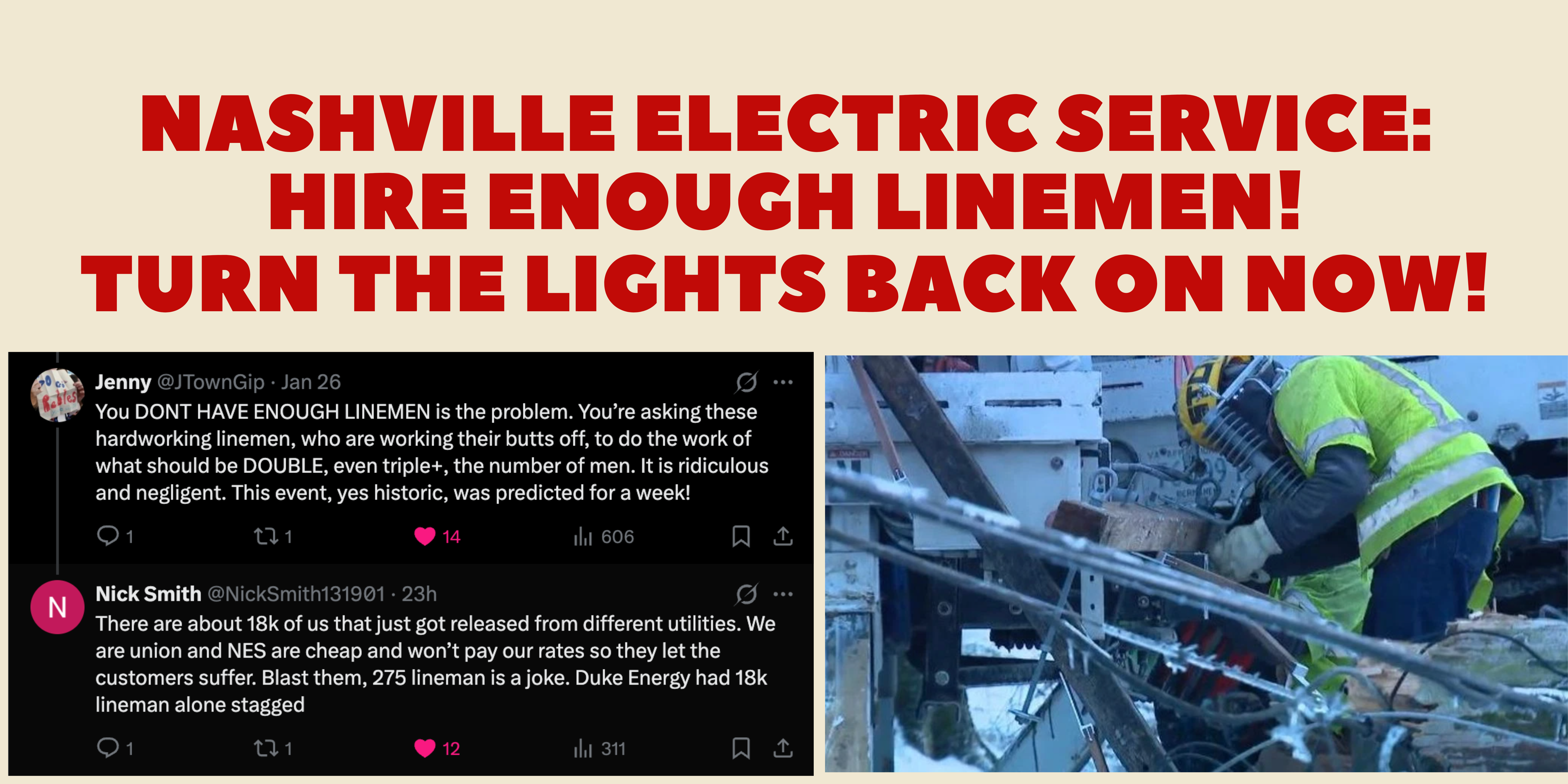 NASHVILLE: HIRE MORE LINEMEN, TURN THE LIGHTS BACK ON NOW!