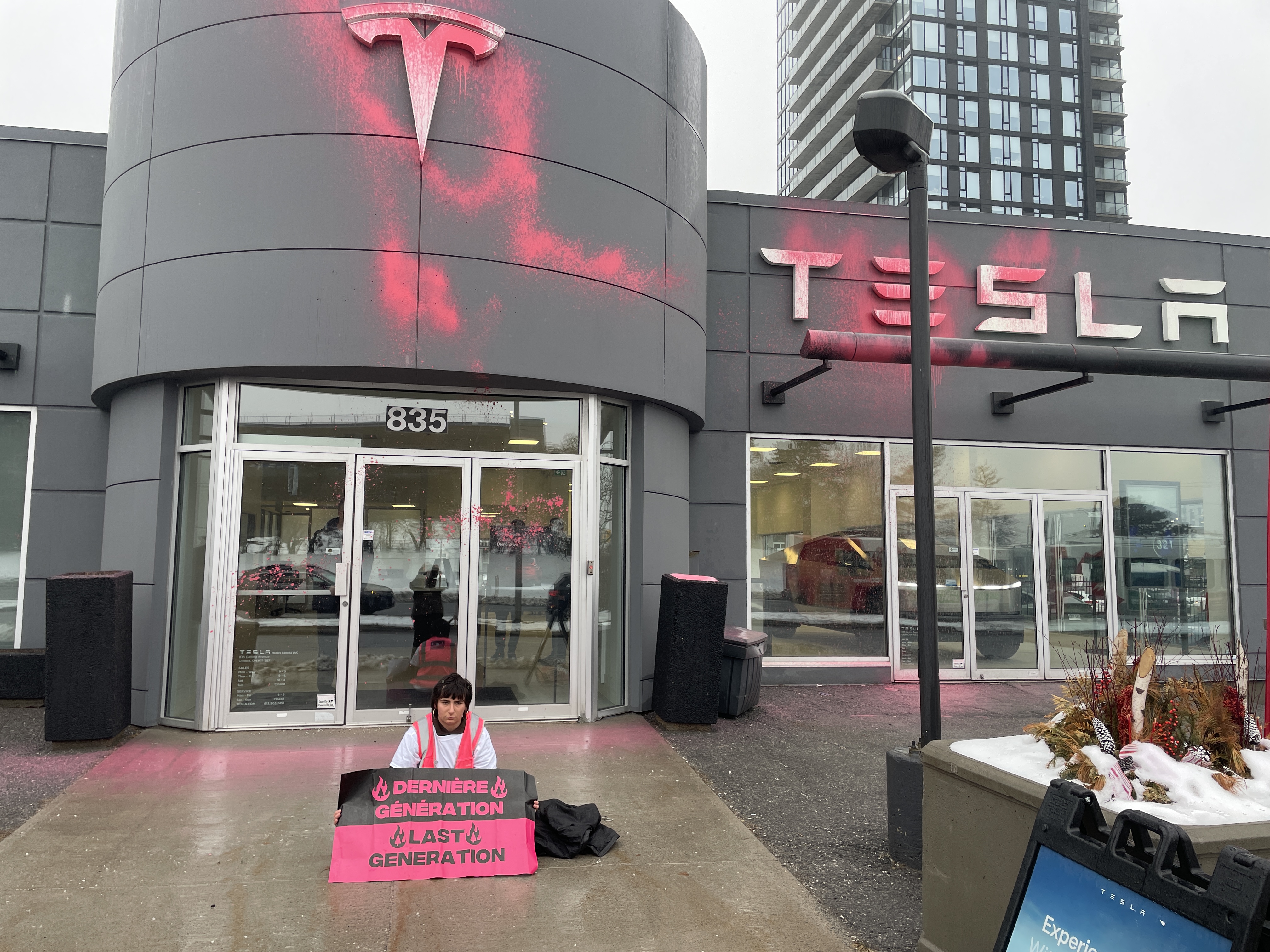 Today, a supporter of Last Generation Canada spray painted the Ottawa Tesla showroom pink.