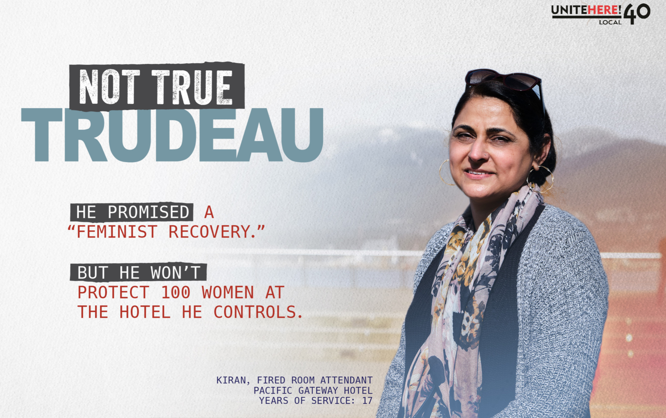 Tell Prime Minister Trudeau to support women at Pacific Gateway by making sure they are reinstated or move the government's business somewhere else. The government should not spend millions of dollars on a hotel that treats women like they’re disposable and destroys living wage jobs.
