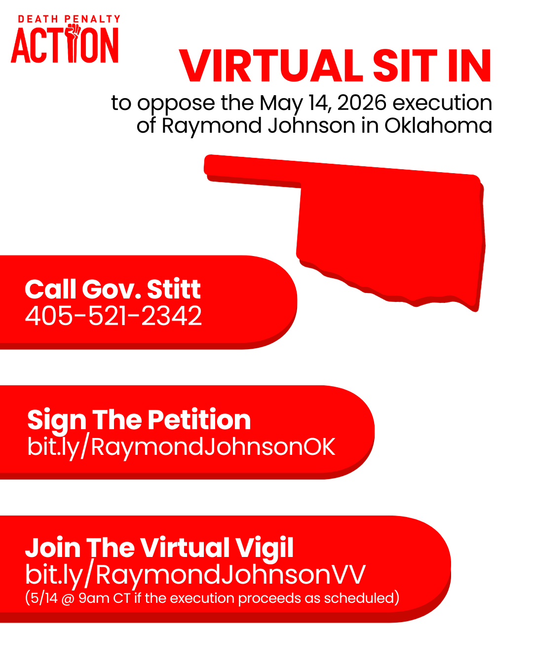 "Hi. My name is [your name]. I am calling to urge Gov. Stitt to grant clemency to Raymond Johnson who faces execution on May 14, 2026. Raymond's case is rife with prosecutorial misconduct, ineffective counsel, and mitigation that was not presented to a jury. Raymond is a member of the Manchester Church of the Brethren in Indiana. He has developed close relationships within his church community, including with is pastor, Kurt Borgmann. Raymond has used his experiences and faith as a force for good, including counseling inside and outside of the prison walls. He is also a writer."