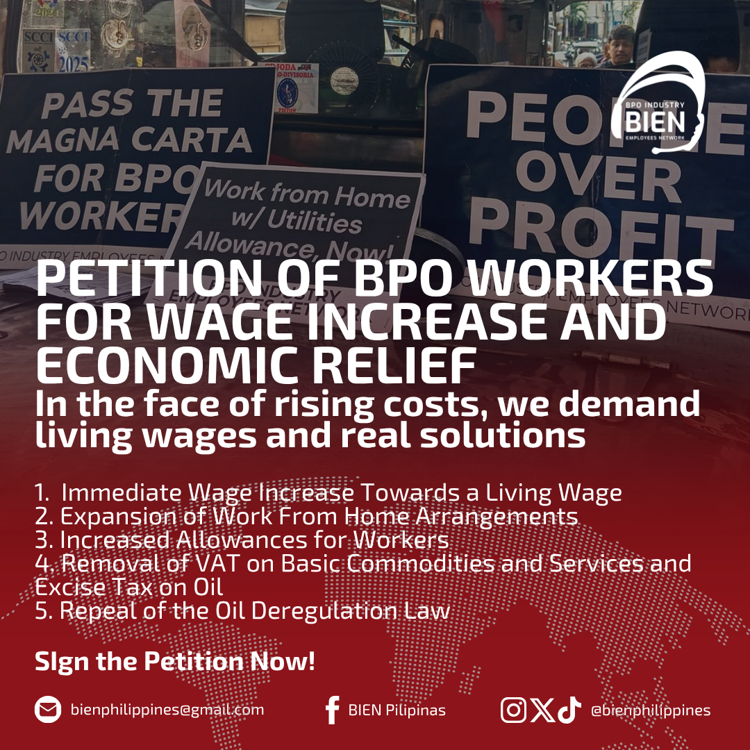We, the undersigned workers from the BPO industry, tech sector, tech-enabled services, labor advocates, and aspiring workers, unite under the banner of BIEN to urgently call for decisive action in the face of a deepening economic crisis.