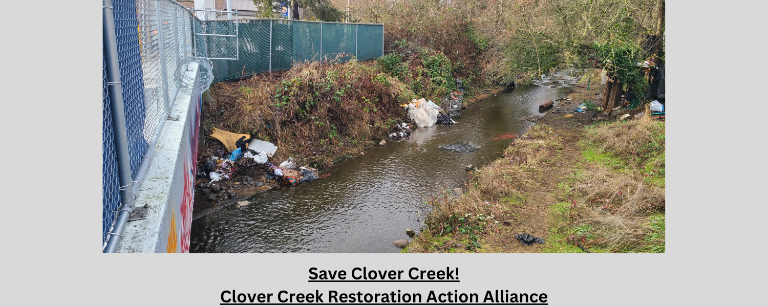 The Clover-Chambers Creek Watershed was once a healthy system, home to five unique populations of salmon and a year-round flow. The ecosystem here sustained people and wildlife for a millennia. Colonization, pollution, and unchecked draining and development have caused immense damage to the main stem of Clover Creek and our whole system, and these consequences have flowed downstream. Clover Creek is the most polluted stream in the county, the salmon have gone extinct, and our groundwater has been drained below the level of the stream, causing vast sections to go dry. Pollution feeds toxic algae blooms in our watershed’s lakes, and huge amounts of impervious surfaces have damaged our natural recharge systems. As residents of the watershed and allies, we seek the restoration of our water systems through the following actions: