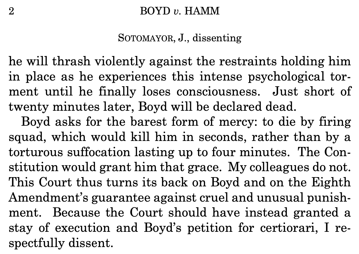- US Supreme Court Justices Sotomayor, Sagan and Jackson would have granted relief. Click here to read Sotomayor's graphic description, challenge and declaration of the unconstitutionality of this "unconstitutional" form of execution.