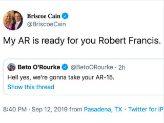 Texas state representative Briscoe Cain made a death threat on his Twitter account @BriscoeCain to presidential candidate Beto O'Rourke. Pursuant to your own policy, you must permanently shut down his Twitter account.