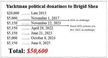 The Austin Chronicle has reported that Brigid Shea was aware of the Yacktman family’s political agenda as early as 2014, in her first campaign for County Commissioner.[4] Nevertheless, she continued to accept their contributions, totaling $50,600 as of June 30, 2025.