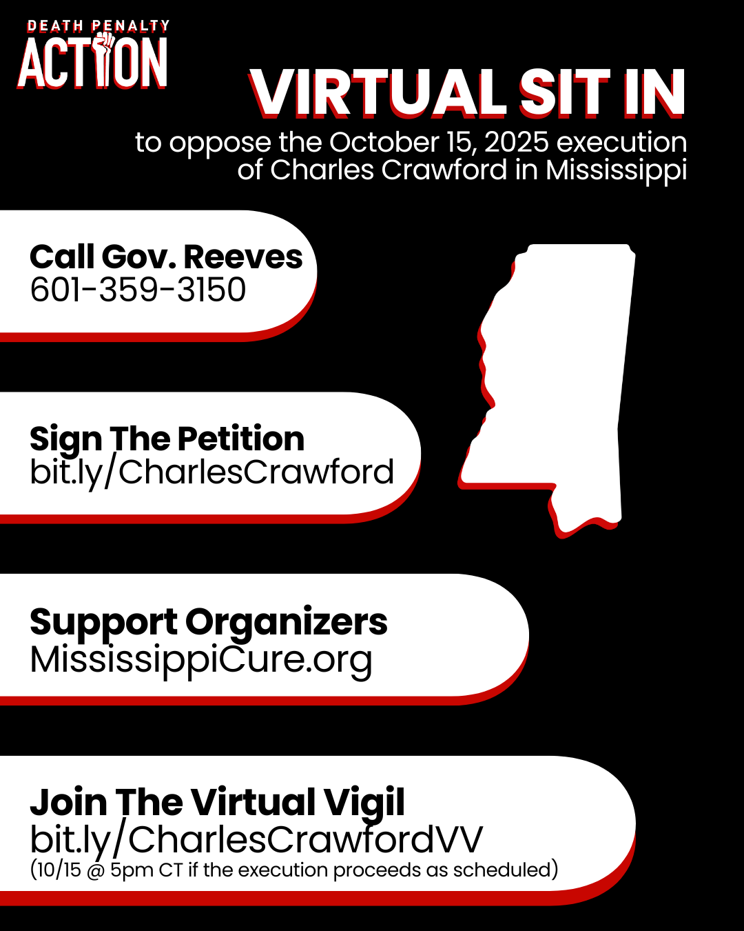 Despite a grossly unfair and unconstitutional trial, the State of Mississippi plans to execute Charles Crawford at 6pm CT on October 15, 2025 for the 1993 kidnapping and killing of 20-year old Kristy Ray.