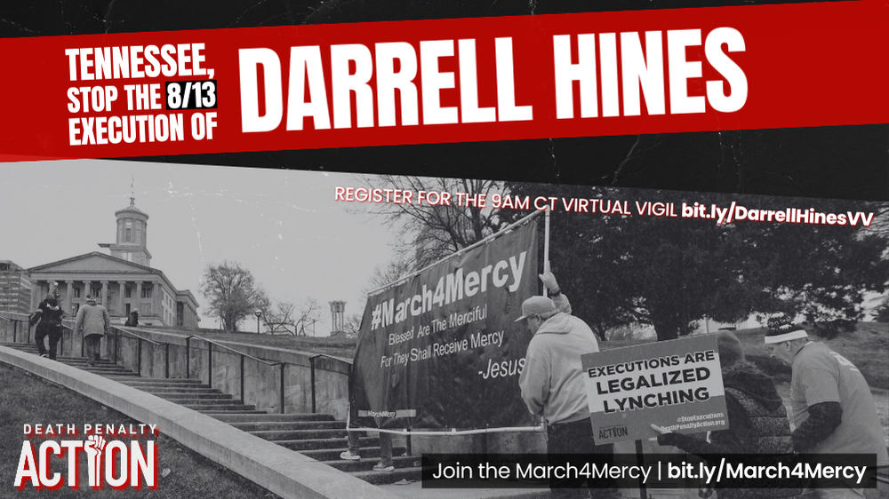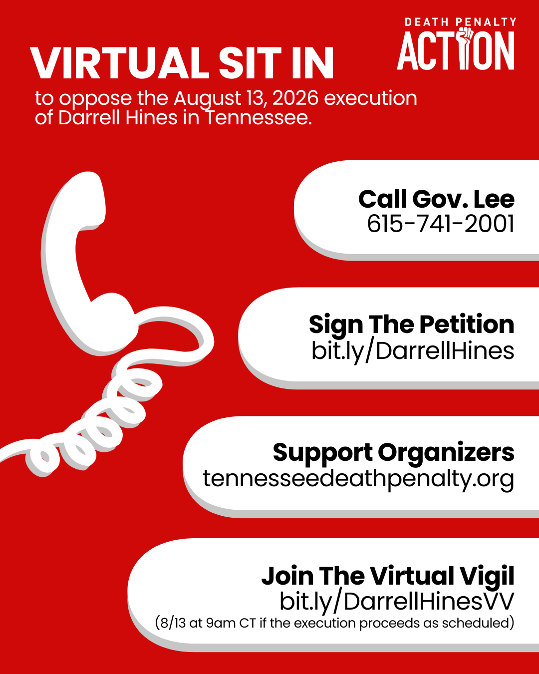 "Hi. My name is [your name]. I am calling to urge Gov. Lee to reverse course and halt all plans to execute Darrell Hines on August 13, 2026. As someone who purports to follow catholic teachings, it is deeply disappointing that he does not extend these teachings to the individual condemned to death in the state of Tennessee."