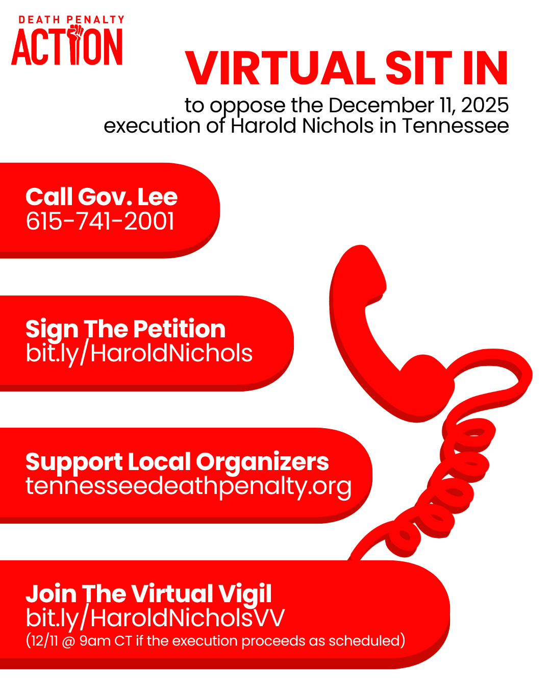 "Hi. My name is [your name]. I am calling to ask that Gov. Lee follows the teachings of his faith and intervene to stop the execution of Harold Nichols on December 11, 2025. Even the District Attorney of Chattagnooga believes that Mr. Nichols' death sentence should be commuted. Death is not the appropriate punishment for Mr. Nichols. We reject the suggestion that the death penalty serves victims - the mother of the victim forgives Harold Nichols. Thank you."