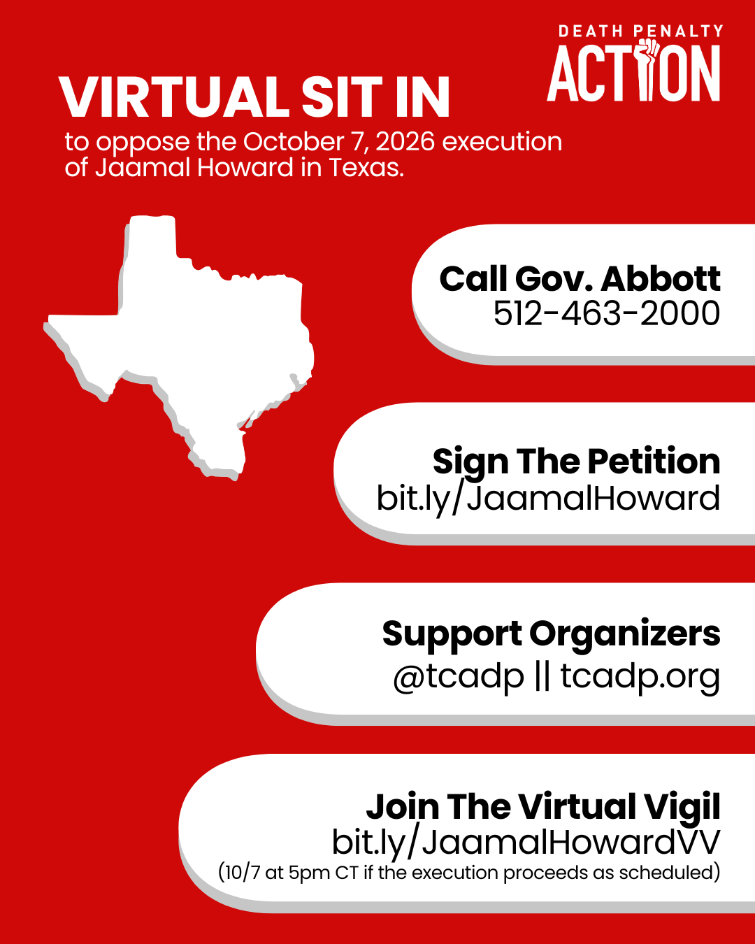 "Hi. My name is [your name]. I am calling to urge Gov. Abbott to intervene to stop the execution of Jaamal Howard on October 7, 2026. We can be safe from people like Jaamal and hold him accountable without killing him. Killing Jaamal will not bring back Roxann or Anthony. During 'Second Chance Month', we urge you to extend mercy. Thank you."