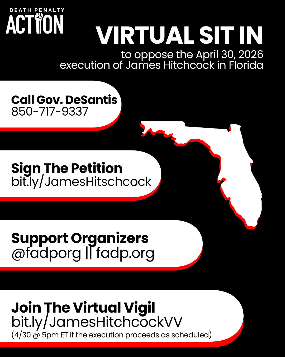 We are writing to you regarding James Hitchcock, who is scheduled for execution in Florida on April 30, 2026 for the 1976 murder of Cynthia Driggers.