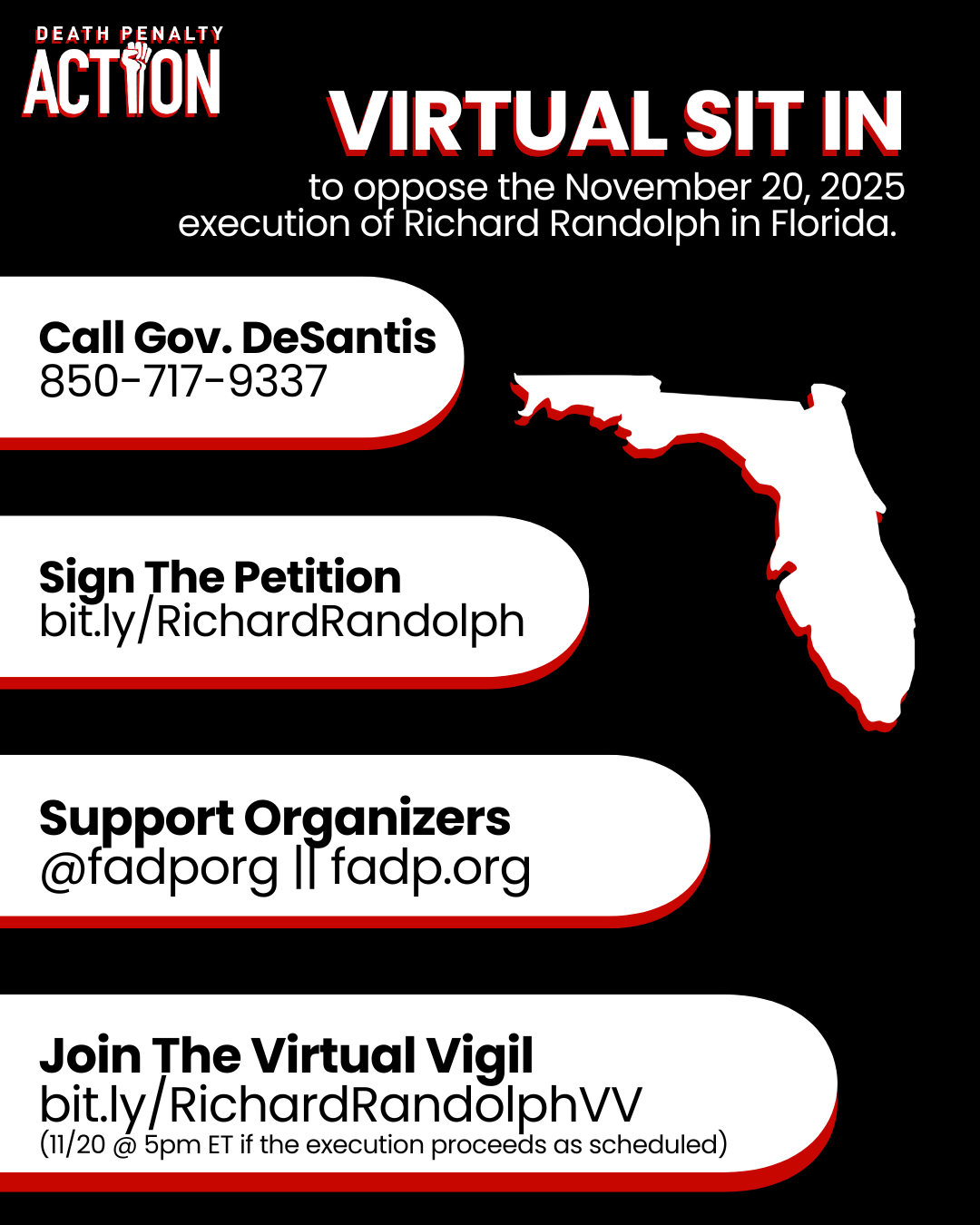 Florida has scheduled a November 20, 2025 execution for Richard 'Malik' Randolph, a Black Army Veteran, who was sentenced to death for the 1988 murder of Minnie McCollum. This is the third warrant in a row signed for a veteran and the 17th of 2025.