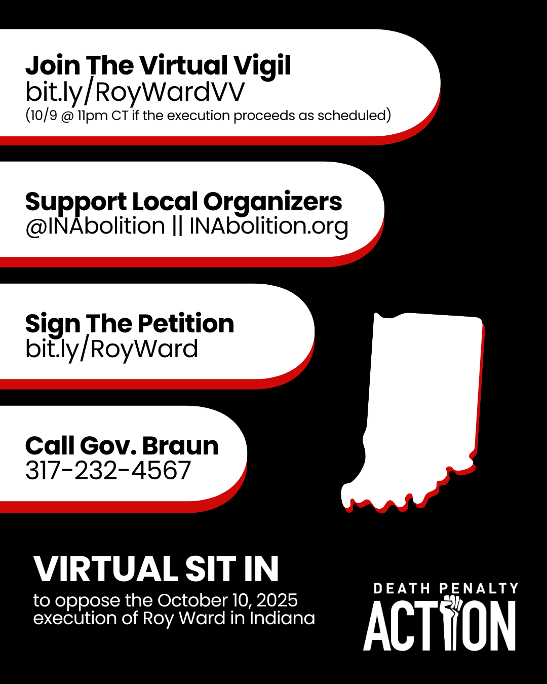 An execution date has been set for Indiana death row prisoner Roy Ward on October 10, 2025 for the 2001 murder of Stacy Payne. October 10 is World Day Against the Death Penalty.