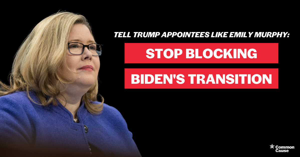 Obstruction of the peaceful transition of power puts our democracy, our national security, and our health at risk. If you believe that GSA Administrator Emily Murphy must do her job and facilitate this transition, add your name today.