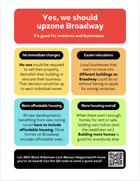 New homes along Broadway will help stabilize housing prices, support increased CTA ridership, and provide much-needed tax revenue to the City. There has been some pushback to the changes, so it’s important we support our Alders in this effort!