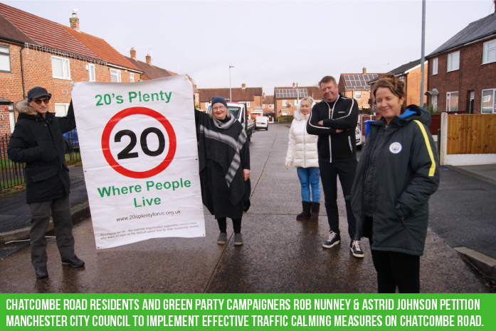 Local residents and Green Party campaigner Rob Nunney are calling on Manchester City Council to resolve the issue of speeding cars down this narrow, residential road of Wythenshawe. Cars are regularly caught on camera speeding down this otherwise quiet road.