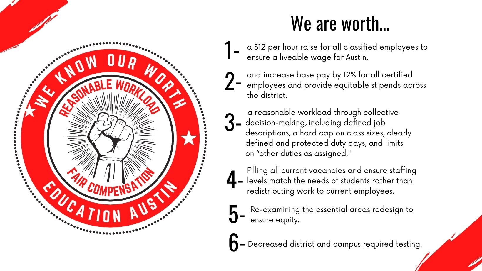 A $12 per hour raise for all classified employees to ensure a livable wage for Austin.