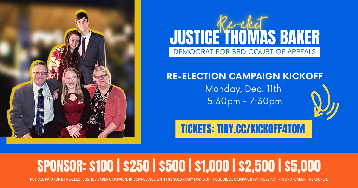 Join us at Mandola's in The Triangle on Monday, Dec. 11th. We’ll discuss Tom's time serving on the 3rd Court of Appeals, and our campaign plan to extend it by one more term. There will be free food and drinks. We hope you can join us!