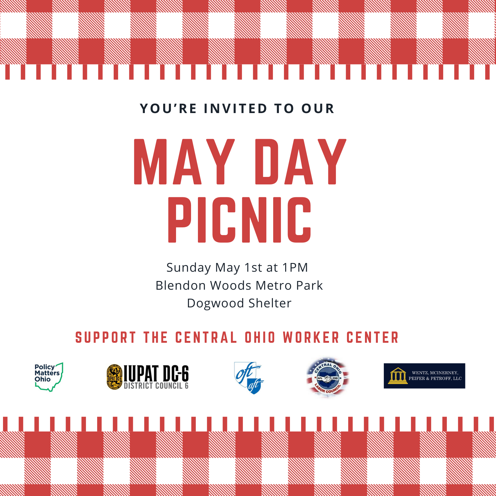Join us for a catered May Day picnic in support of the Central Ohio Worker Center. COWC is a non-profit organization that educates, empowers, and advocates for and with low-wage and immigrant workers in Central Ohio. This event is sponsored by some incredible community partners: Policy Matters Ohio, International Union of Painters and Allied Trades DC-6, Ohio Federation of Teachers, Central Ohio Labor Council, and the law firm of Wentz, McInerney, Peifer & Petroff, LLC.