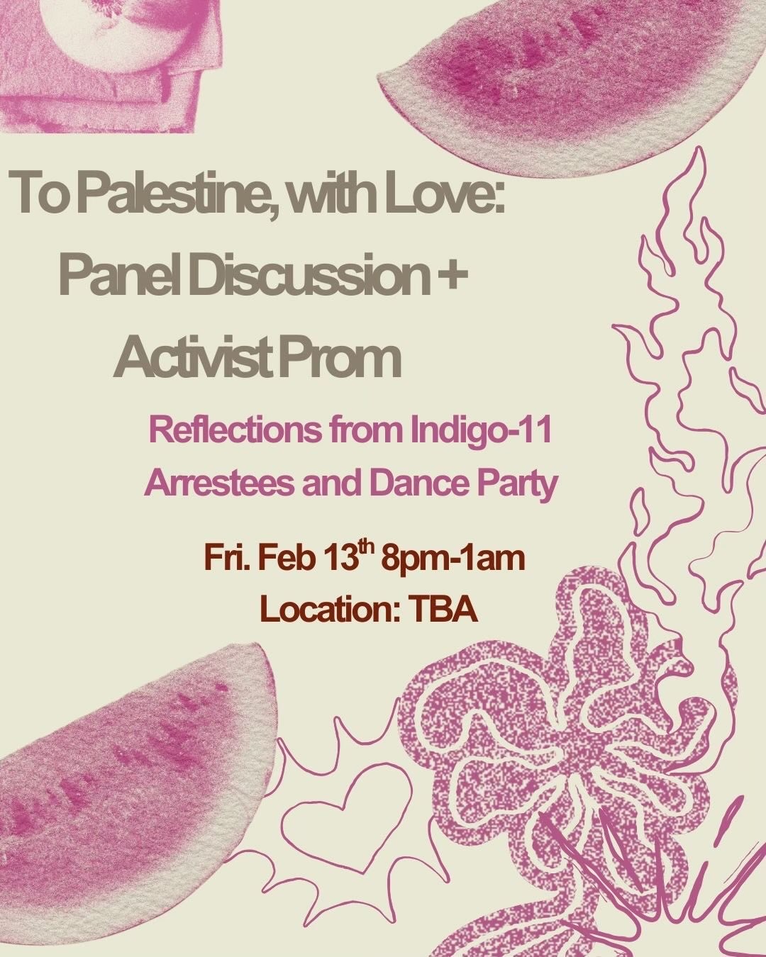 First come and hear our thoughts about what the Indigo folks have learned from these two years of struggle on policing of protest, organizing amidst repression and the struggle for a free Palestine. Then we will dance.