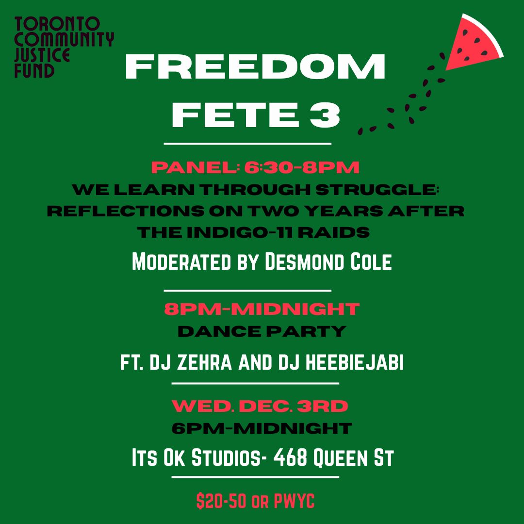 Join us for a night of festivities and reflection. First we’ll have a roundtable to share what we’ve learned from these two years of struggle, and then we’ll dance! All proceeds go to the Toronto Community Justice Fund, supporting all those arrested for Palestine solidarity activism.